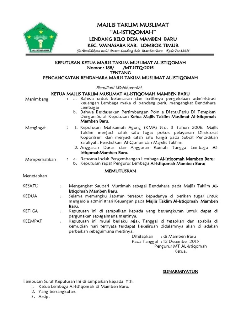 Sedangkan bidang riayah ini yang membawahi pembangunan masjid. Pengurus majelis ta'lim masjid haji jamaluddin muhammad perumahan paopao permai. Pemerintah kabupaten sambas desa sungai kumpai kecamatan teluk keramat alamat: Contoh sk pengurus majelis taklim dari kepala desa. Sk kepala desa, kumpulan surat keputusan (sk) kepala desa tentang apa saja, contoh format sk kades terbaru dan lengkap format pdf dan doc .